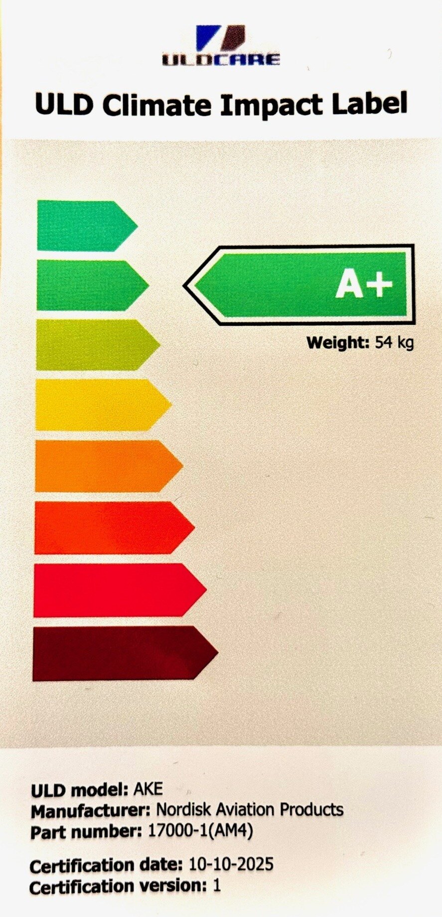 In October 2025, Nordisk Aviation Products achieved an A+ rating for our AKE container under ULD Care’s new Climate Impact Label Certification. The certification assesses environmental performance across weight efficiency, material composition, and lifecycle management. At just 54 kg, our AKE container exemplifies Nordisk’s commitment to lightweight, durable, and recyclable design, helping to reduce aircraft fuel consumption and CO₂ emissions.
